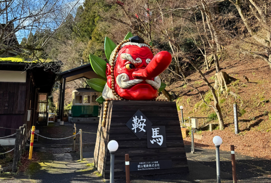駅前の天狗|叡山電鉄「鞍馬駅」の前には、巨大な天狗のモニュメントがあり、人気の撮影スポットになっています。