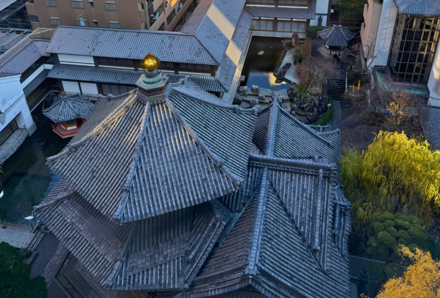 ビルに囲まれた絶景|隣接するウエスト18ビルの展望エレベーターからは、本堂が美しい「六角形」をしている様子を真上から見下ろすことができ、撮影スポットとして人気です。