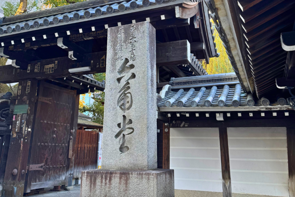 門をくぐってすぐの場所にある六角形の石は「へそ石」と呼ばれ、京都のちょうど中心地であることを示しています。平安京造営の際、街路の邪魔にならないよう本堂が自ら北へ移動した際、もともとの位置に取り残されたのがこの石だという不思議な伝説が残っており、京都の「中心(へそ)」を象徴するスポットとして愛されています。